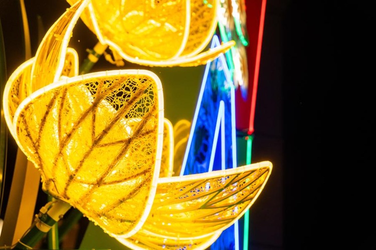 Choć konstrukcja pozostała ta sama, wiosenna odsłona neonu wygląda zupełnie inaczej niż zimowa. Świąteczną gwiazdę zastąpiło słońce, a poszczególne litery zyskały własną, niepowtarzalną scenografię — struktury roślinne, brokatowe powierzchnie i efekty świetlne LED. Całość uzupełniają przestrzenne kwiaty i inne sezonowe elementy. Instalacja ma zaskakiwać: co jakiś czas zmieni swój wygląd, dostosowując się do pory roku i okazji.